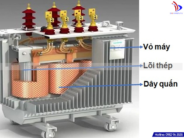 Cấu tạo chung của mọi máy biến áp gồm 3 thành phần chính: Lõi thép, dây quấn và vỏ máy.